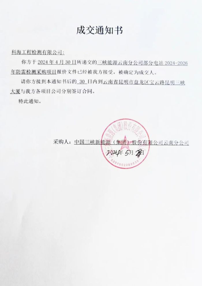 追風趕月莫停留,平蕪盡處是春山。近日,公司經(jīng)營捷報頻傳,喜訊連連,成功中標“華能瀾滄江新能源公司防雷檢測”、“三峽能源云南分公司防雷檢測采購”兩個項目,實力再獲市場認可。